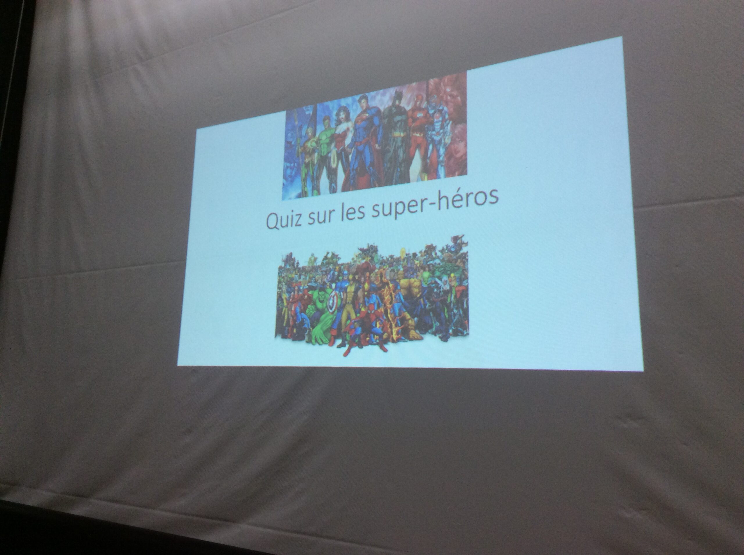 Patrick Marleau, ancien libraire spécialisé en bande dessinée, ancien président du Festival de la bande dessinée francophone de Québec, chroniqueur à la télé et à la radio, auteur de la série Touchdown avec Étienne Boulay, ainsi que de la série Les guerriers fantômes, a présenté aux jeunes un questionnaire très intéressant sur l’histoire des super-héros.
