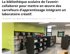 Un article portant sur les carrefours d’apprentissage a été publié tout récemment dans le Canadian School Library Journal. Sur cet article, vous serez informé sur la transformation des bibliothèques d’écoles de la CSDM et sur les fruits de la collaboration entre l’équipe des bibliothécaires, les services pédagogiques et le service des ressources matérielles de la CSDM.