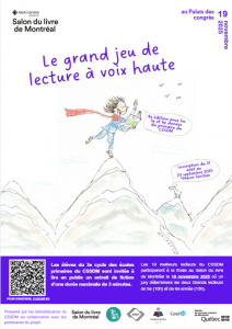 Pour une 4e année consécutive, en partenariat avec le Salon du livre de Montréal, les bibliothécaires du CSSDM invitent les élèves de 5e et 6e années à participer au Grand jeu de lecture à voix haute, une activité qui met à l’honneur la passion de la lecture à voix haute et la promotion de la littérature jeunesse. Le ou la meilleur·e lecteur·trice de chaque école aura la chance de lire un extrait de son choix (maximum 3 minutes) en public, au Salon du livre de Montréal, le 19 novembre 2025.