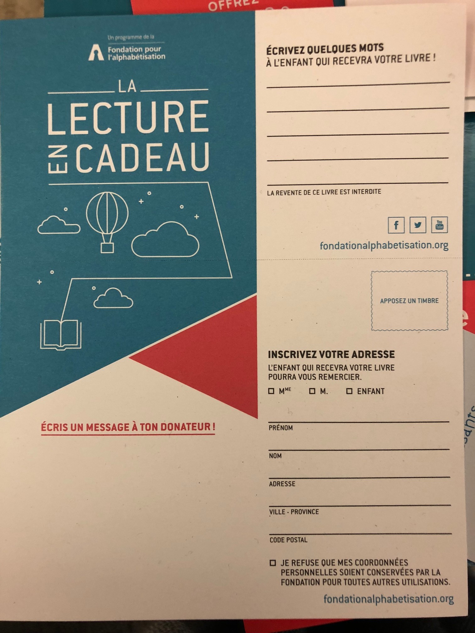 Sachez aussi que cette année, La Fondation pour l’alphabétisation s’est fixé un objectif audacieux, celui de remettre 100 000 livres jeunesse neufs à autant d’enfants dans les 17 régions du Québec. ET l’objectif fut atteint ! Le tout grâce aux efforts des gens inspirants.