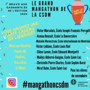 Le Grand Mangathon de la CSDM se déroulant du 1er février au 9 mars 2020 se termine en beauté avec la distribution de 8 prix de participations aux ados fans de Manga qui ont partagé le fruit de leurs lectures!