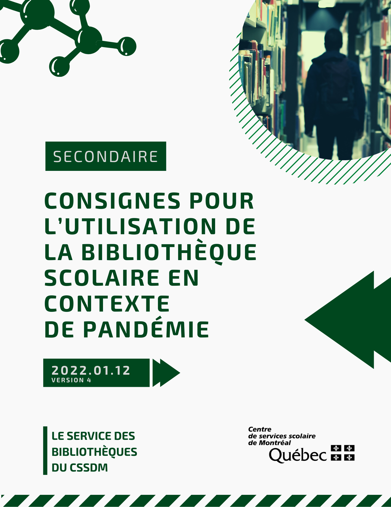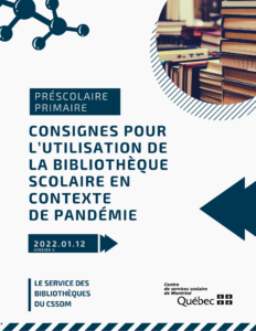 Les consignes pour l’utilisation de la bibliothèques scolaire seront actualisées régulièrement selon les directives de l’Institut national de santé publique du Québec et les consignes applicables en milieu scolaire en contexte de pandémie du ministère de l’Éducation. Consultez, téléchargez et partagez !